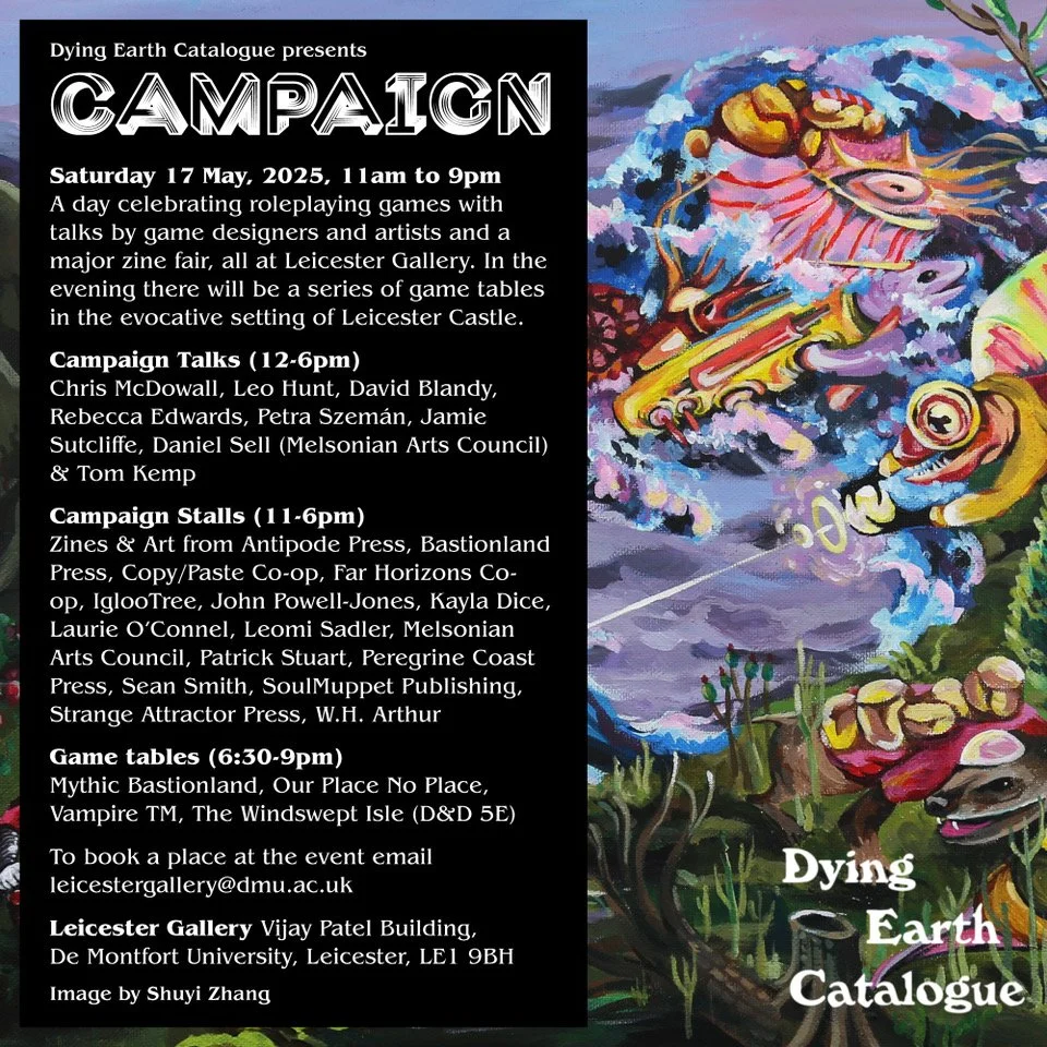 Join us for a day curated by Dying Earth Catalogue celebrating roleplay games through a range of talks from indie game designers and artists, housed amongst a wide range of hobby stalls at Leicester Gallery. The day will close with a series of evening game tables in the evocative setting of Leicester Castle.